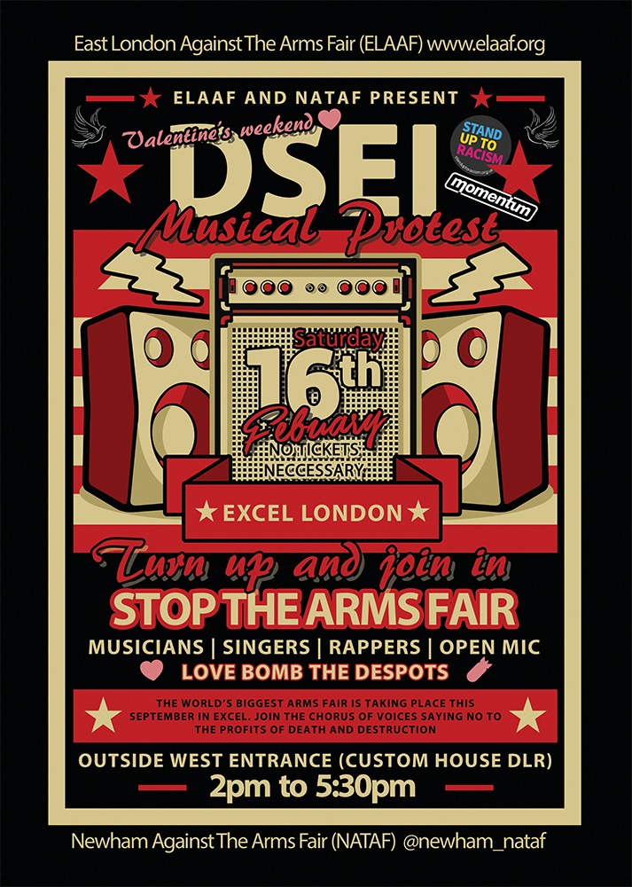 Musical Protest Against The Arms Fair ….Sat 16th Feb …All welcome …ExCeL West Entrance Custom House. 2 – 5.30pm